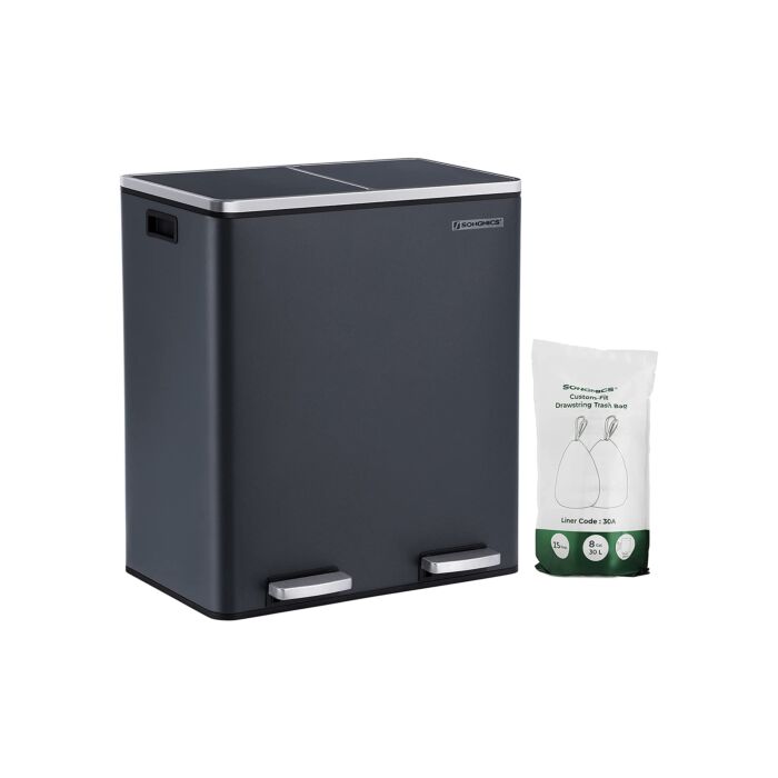 Dit afvalscheidingssysteem beschikt over twee kunststof binnenemmers van elk 30 liter, zodat u moeiteloos afval kunt scheiden en recyclen. Dankzij het handige voetpedaal werkt u volledig handsfree. De duurzame grijze afvalbak is gemaakt van hoogwaardig materiaal en gaat jarenlang mee.