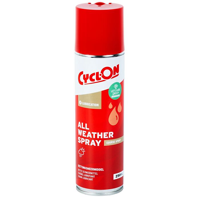 De Cyclon® All Weather Spray wordt geleverd in een handige spraybus met een inhoud van 250 ml. Het product is samengesteld uit een dunne vloeistof die gemakkelijk door de verschillende componenten heendringt, waardoor het ideaal is voor gebruik op verschillende materialen.