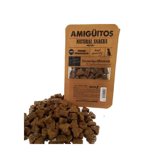 Amiguitos hondensnacks met eend bevatten geen vleesmeel of andere gedroogde ingrediënten zoals gluten, aardappel, rijst, maïs of granen. Ze bestaan uit 85% vlees/vis en 15% gekiemde peulvruchten, vitaminen en plantenextracten. Rijk aan Omega-3 en Omega-6 vetzuren, koolhydraatarm ter voorkoming van tandsteenvorming en vrij van tarwe, rijst, maïs en aardappel. Voer met mate en zorg altijd voor voldoende vers drinkwater.