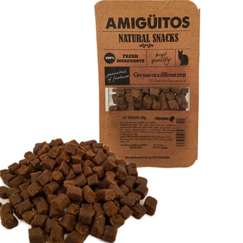 De Amiguitos kattensnack met kip is een overheerlijke semi-moist kattensnack. Het perfecte tussendoortje voor je kat of kitten, bereid met uitsluitend verse ingrediënten.