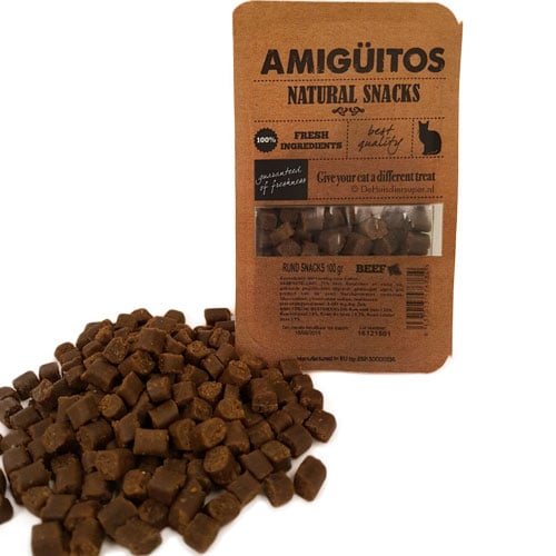 De Amiguitos kattensnack met rund is een overheerlijke semi-moist kattensnack. Bereid van uitsluitend verse ingredienten voor extra veel smaak.