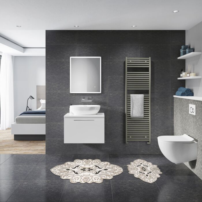 Badmatset (2 stuks) 100% polyester 1300 g/m² Poolhoogte: 10 mm Antislip onderzijde Antibacterieel Machinewasbaar Badmat: 50 x 60 cm (1 stuk) Badmat: 60 x 100 cm (1 stuk)