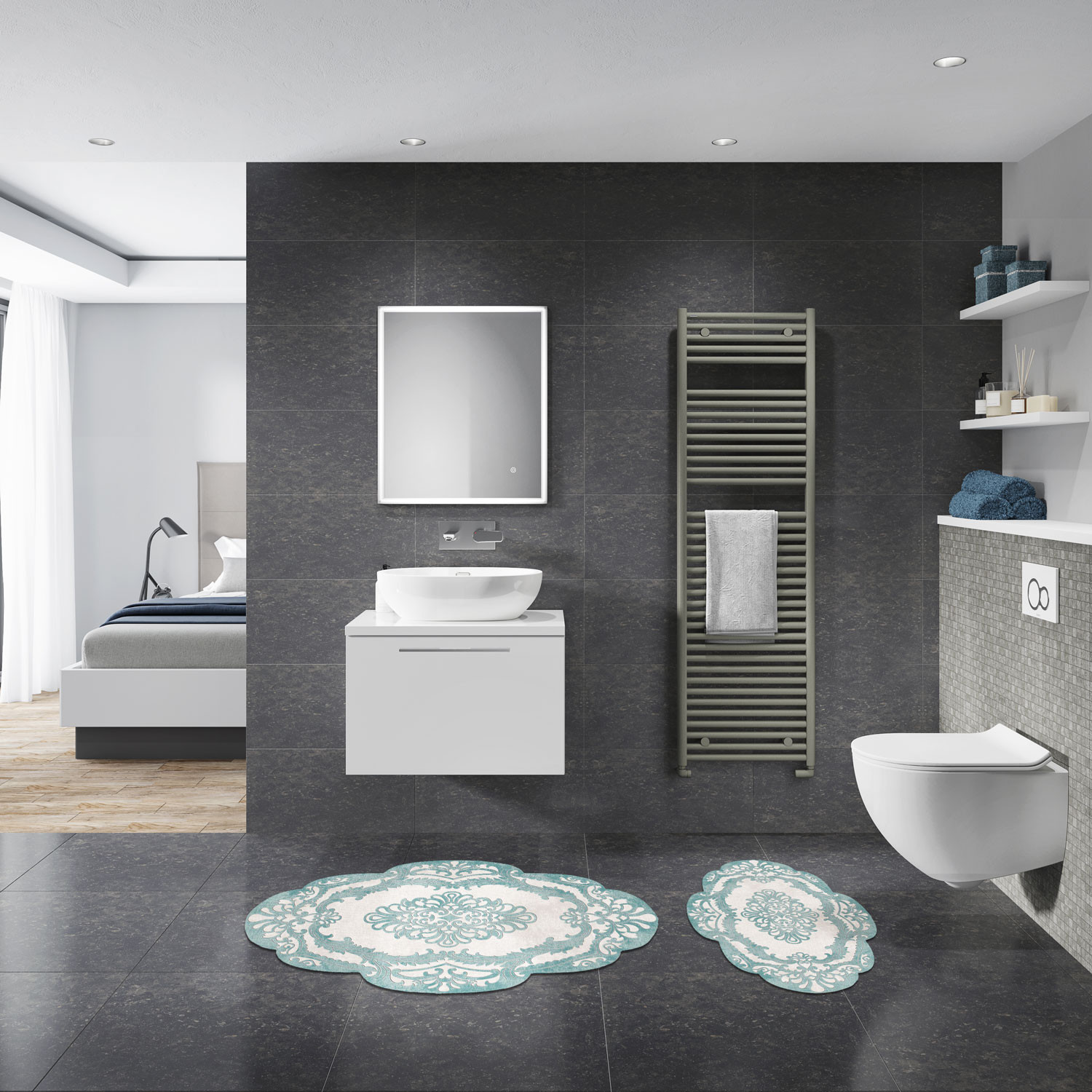 Badmatset (2 stuks) 100% polyester 1300 gr/m Poolhoogte: 10 mm Antislip-onderzijde Antibacterieel Machinewasbaar Badmat: 50 x 60 cm (1 stuk) Badmat: 60 x 100 cm (1 stuk)