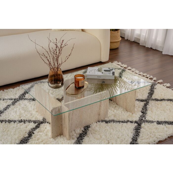 Transformeer je leefruimte met onze prachtige travertijn marmeren salontafel. Dit schitterende stuk voegt een vleugje elegantie en verfijning toe aan elke kamer, waardoor het een warme en uitnodigende sfeer creëert voor jou en je gasten. Het blad van 100% gehard glas zorgt voor een strakke en moderne uitstraling, terwijl het frame van gemelamineerd spaanplaat duurzaamheid en stabiliteit biedt.