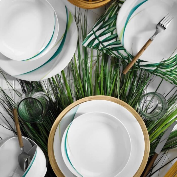 Ons servies is gemaakt van 100% porselein en straalt een tijdloze schoonheid uit die je gasten zal betoveren en een blijvende indruk zal achterlaten. Het delicate witte porselein wordt prachtig aangevuld door de levendige tinten turquoise en groen, waardoor elke maaltijd een vleugje verfijning krijgt.