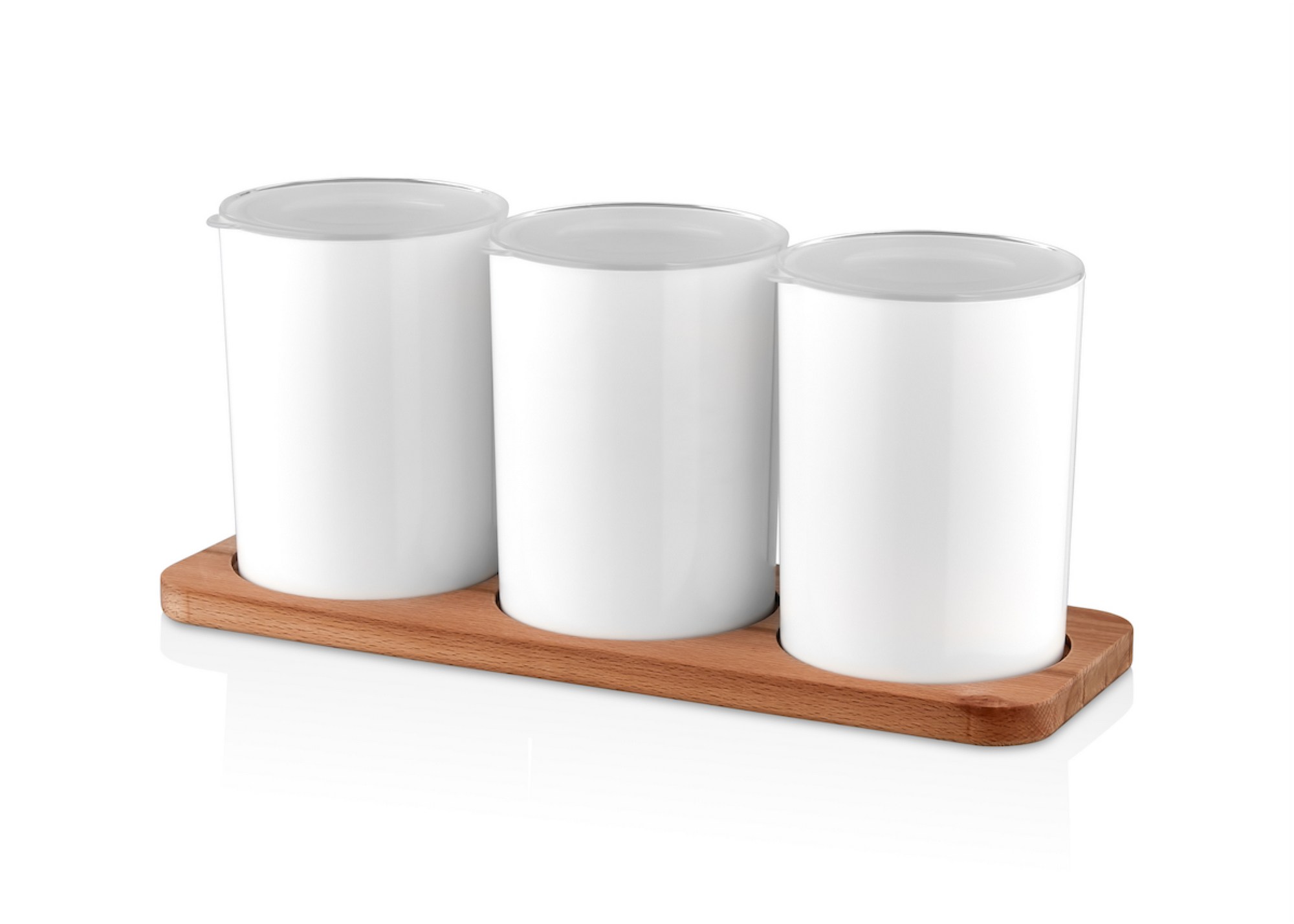 De set bestaat uit drie potten (10 x 10 x 14 cm, 800 cc) en een houten standaard (33 x 11,5 x 15 cm). Perfect voor het georganiseerd bewaren van kruiden, granen of snacks. De houten standaard geeft een rustieke uitstraling en verbetert de algehele sfeer in je keuken.
