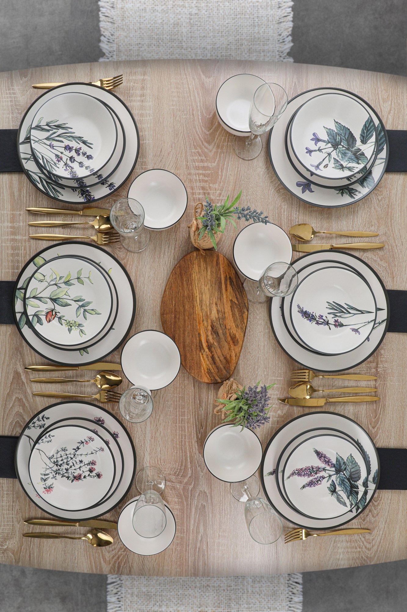 Deze 24-delige set bestaat uit dinerborden, lunchborden, soep/pastaborden en dessertschalen en biedt je alles wat je nodig hebt voor een complete eetervaring. De elegante combinatie van witte, groene, paarse en zwarte kleuren voegt een vleugje levendigheid toe aan je tafelsetting, waardoor elke maaltijd een lust voor het oog wordt.