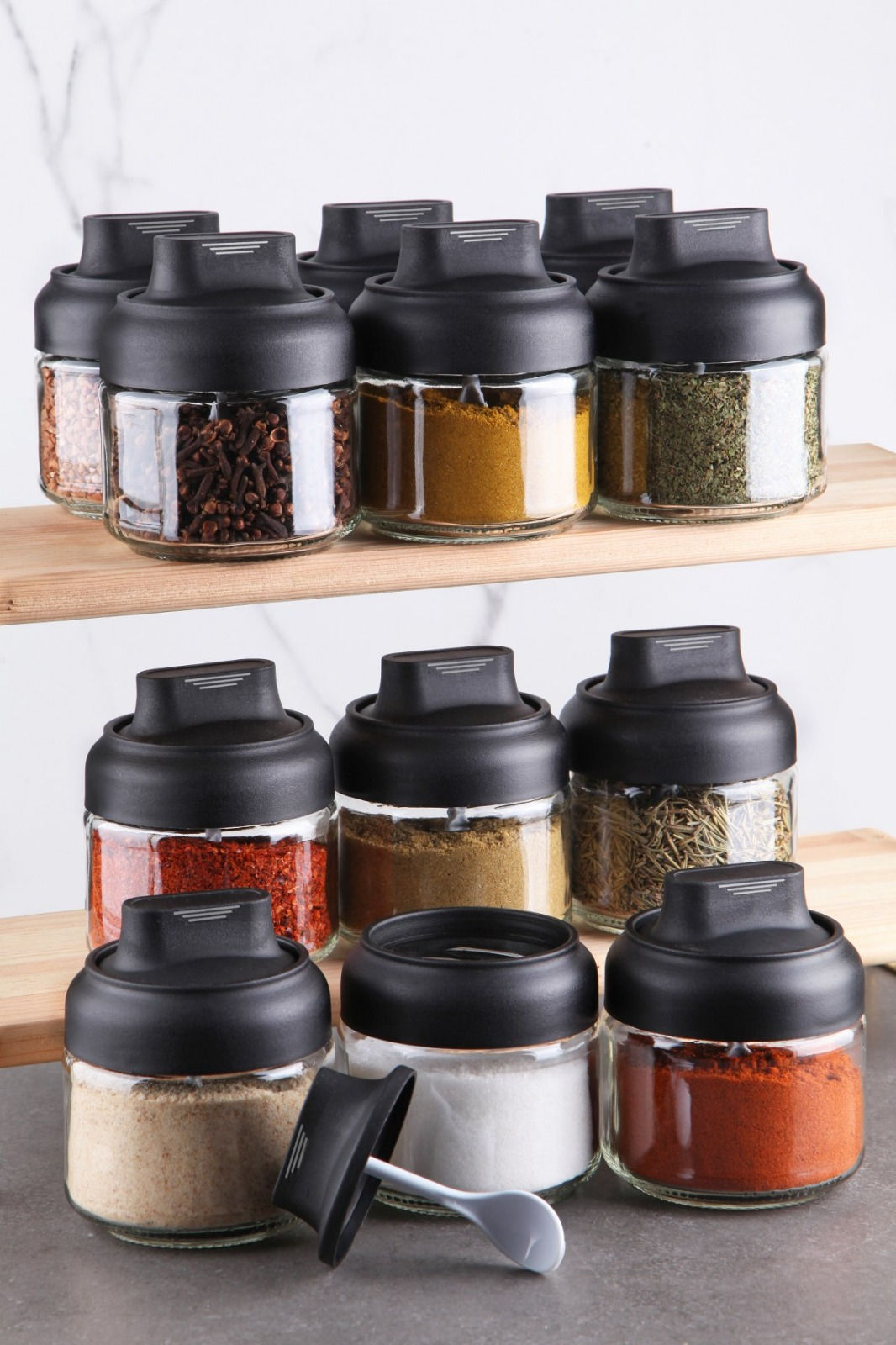 Deze set van 12 kruidenpotjes is niet alleen praktisch maar ook esthetisch aantrekkelijk. De elegante zwarte kleur past perfect in moderne keukens en voegt een geraffineerde uitstraling toe aan je kookruimte. Het ontwerp maakt het gemakkelijk om snel het juiste kruidenpotje te vinden, waardoor je kookervaring veel aangenamer wordt.