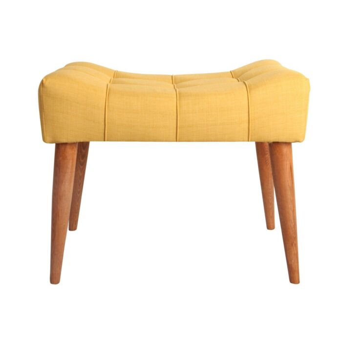 Het moderne ontwerp van de poef voegt stijl en elegantie toe aan elke ruimte. De levendige gele kleur creëert een vrolijke sfeer, terwijl het massief houten frame zorgt voor stabiliteit en duurzaamheid.