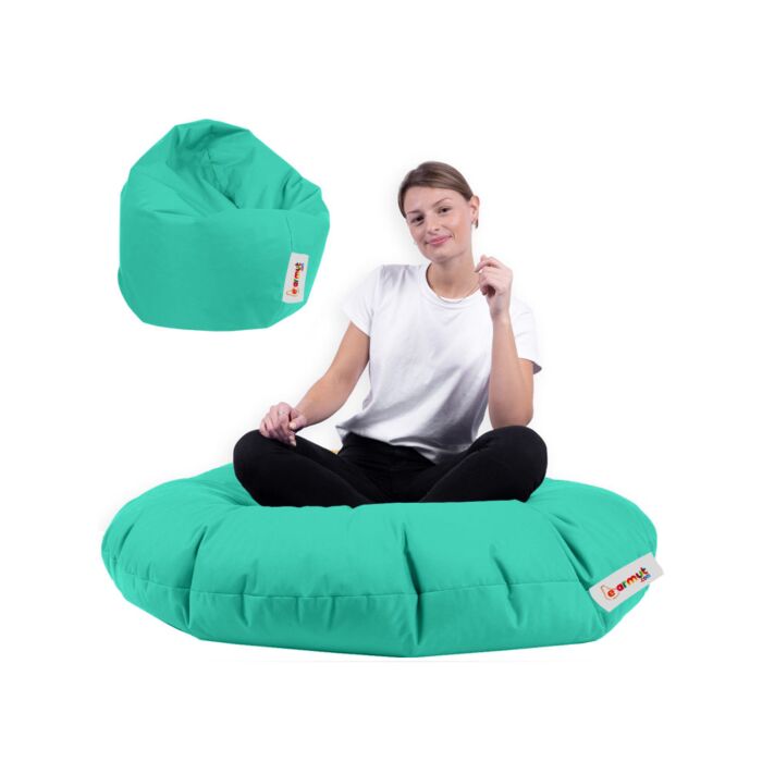- Technische details: Stof: 100% polyester • Diameter zitting: 100 cm • Hoogte kussen: 100 cm • Zithoogte kussen: 20 cm • Poefvormige zitting: 65 cm hoog en breed • Verborgen dubbele ritssluiting • Zonder voering • Kleur: turkoois