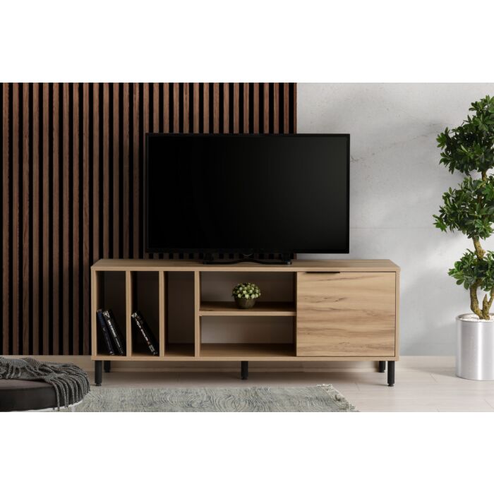 Dit TV-meubel is gemaakt van 100% gemelamineerd spaanplaat met een dikte van 18 mm, wat zorgt voor uitzonderlijke stevigheid en stabiliteit. De metalen poten van 12 cm hoog bieden extra stabiliteit. De afmetingen zijn: Breedte 140cm, Hoogte 55cm, Diepte 40cm. De eiken afwerking voegt een stijlvolle flair toe aan elke kamer.