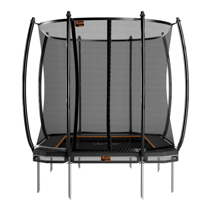 De Avyna Pro-Line InGround trampoline met veiligheidsnet in zwart, met afmetingen van 340 x 240 cm (234), is ontworpen voor veilig en duurzaam springplezier. Deze rechthoekige trampoline bevindt zich ongeveer 20 cm boven de grond en heeft een Royal Class veiligheidsnet en zwarte rand die de veren volledig afdekt, waardoor de veiligheid wordt gewaarborgd bij elke sprong.