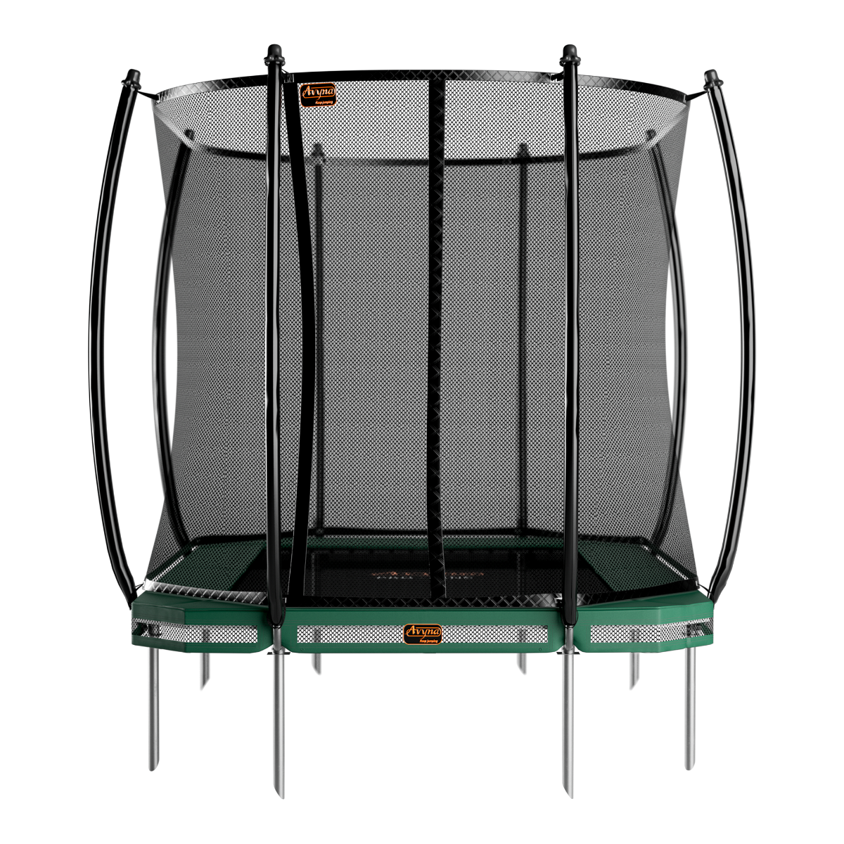 De Avyna Pro-Line InGround trampoline met veiligheidsnet van 340 x 240 cm (234) in de kleur groen is een ideale keuze voor jouw tuin. Deze rechthoekige trampoline is ingegraven en komt ongeveer 20 cm boven de grond uit, waardoor hij een strakke uitstraling geeft. De trampoline is voorzien van een Royal Class veiligheidsnet, dubbel gegalvaniseerde veren en een soepele springmat voor ultiem plezier en veiligheid.