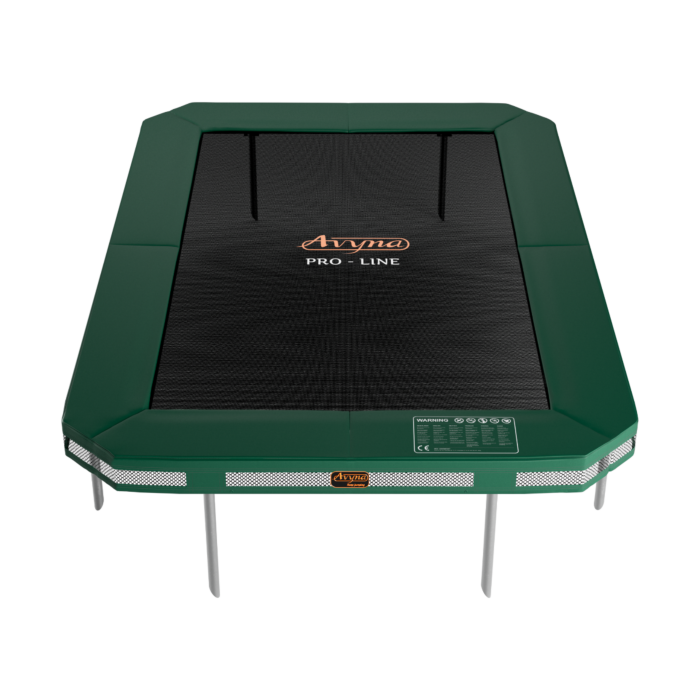 De Avyna Pro-Line InGround trampoline van 380 x 255 cm (238) in de kleur groen is een grote rechthoekige trampoline geschikt voor uren springplezier. Met een hoogte van 20 cm boven de grond biedt deze trampoline veel ruimte om veilig te springen. De trampoline is voorzien van een groene rand die de veren volledig bedekt en blijft netjes liggen bij elke sprong. De rand is uitgerust met luchtroosters voor optimaal comfort tijdens het springen.