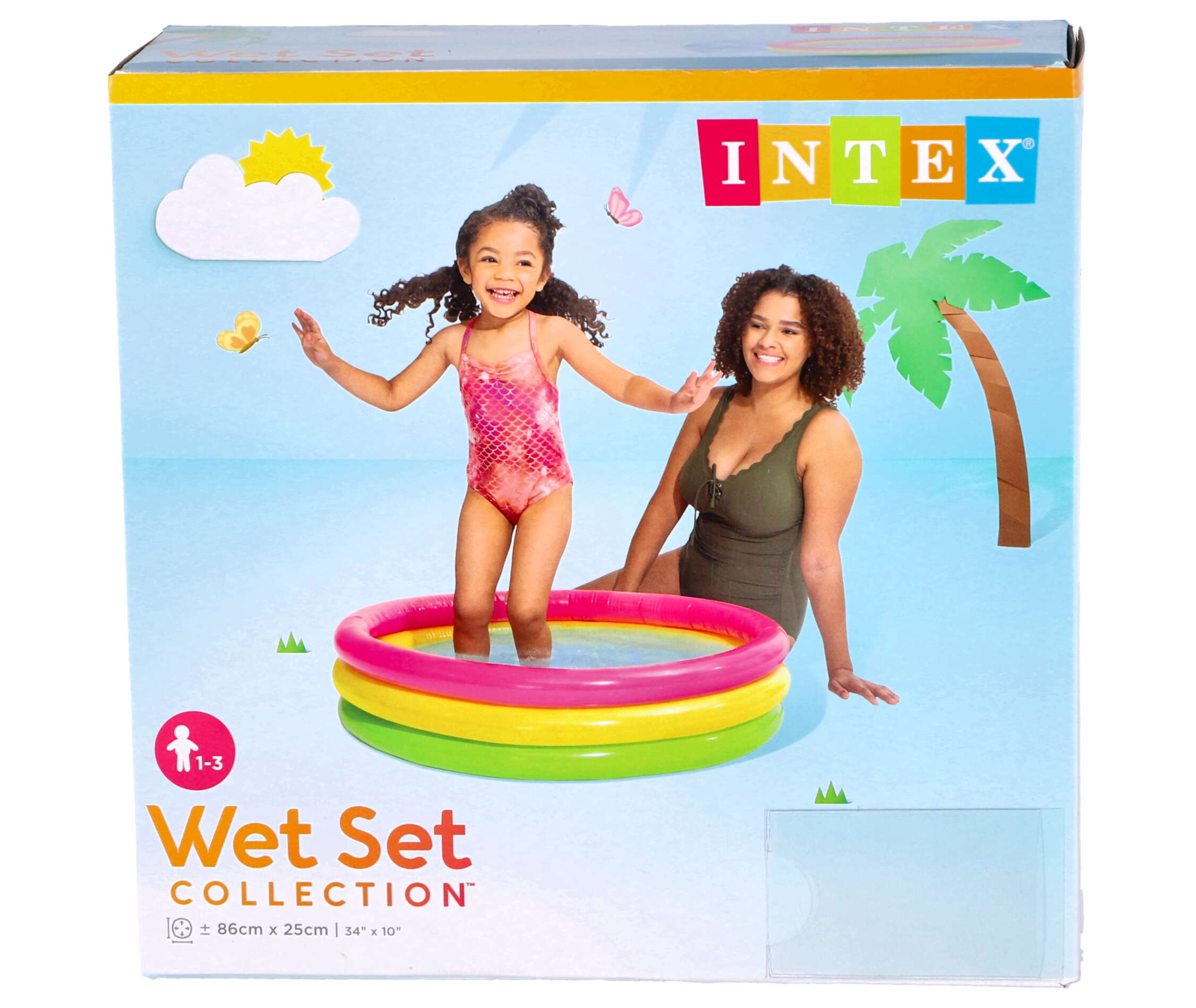 Geniet van eindeloos spetterplezier met het Babyzwembad Sunset Glow. Dit vrolijke, kleurrijke zwembadje biedt een veilige en comfortabele speelplek dankzij de zachte, opblaasbare ondergrond en stevige vinylranden.