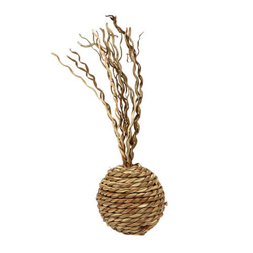 Speelbal voor de kat voorzien van een vrolijke pluim. De bal is omwikkeld met gevlochten stro. De pluim is van hetzelfde materiaal als de bal.