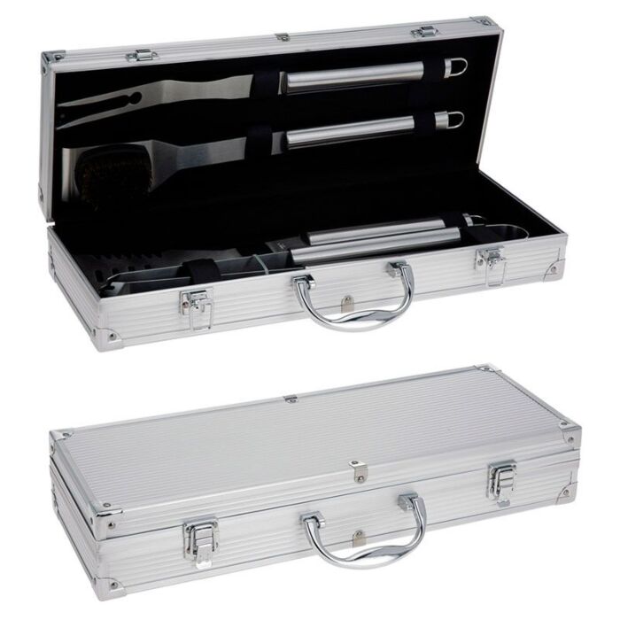 De barbecueset bestaat uit vier essentiële gereedschappen, vervaardigd van robuust roestvrijstaal voor extra duurzaamheid en lange levensduur. De inbegrepen luxe aluminium koffer (afmetingen: 46x16x8 cm) biedt een veilige en stijlvolle manier om uw gereedschap op te bergen.