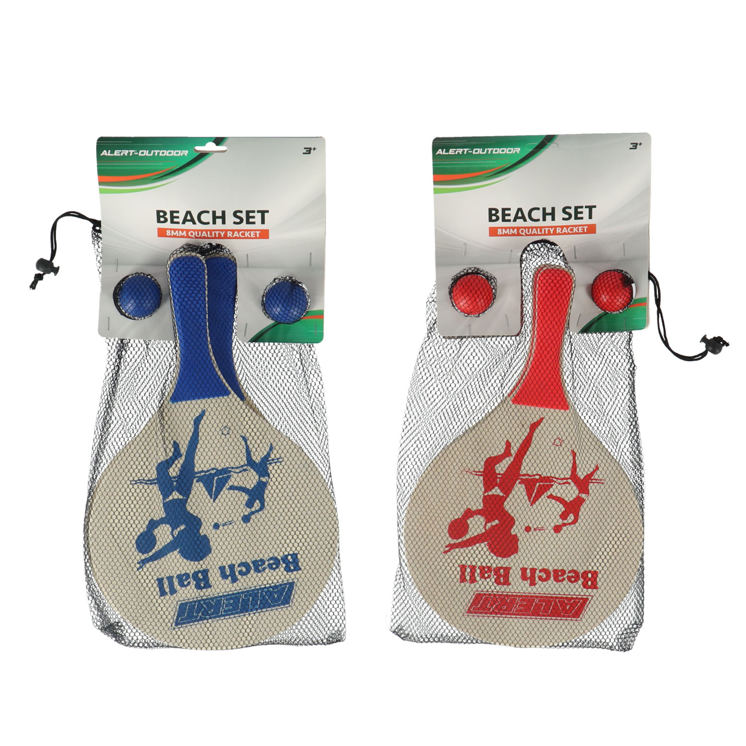 De set is ontworpen voor optimale prestaties en comfort tijdens het spelen. Het houten materiaal zorgt voor een stevige grip en een klassieke uitstraling op het strand.