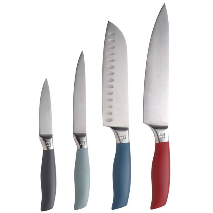 Deze luxe messenset van Bergner behoort tot de high-end klasse onder de keukengerei. De set, ook bekend als Jumpy, omvat vier van de meest gebruikte messen die essentieel zijn voor elke kookliefhebber. Elk mes is vervaardigd uit hoogwaardig roestvrij staal, waarbij de gekleurde ergonomische handgrepen zijn gemaakt van PP-plastic. Dit ontwerp zorgt ervoor dat de messen comfortabel in de hand liggen en biedt een veilige grip tijdens het snijden.