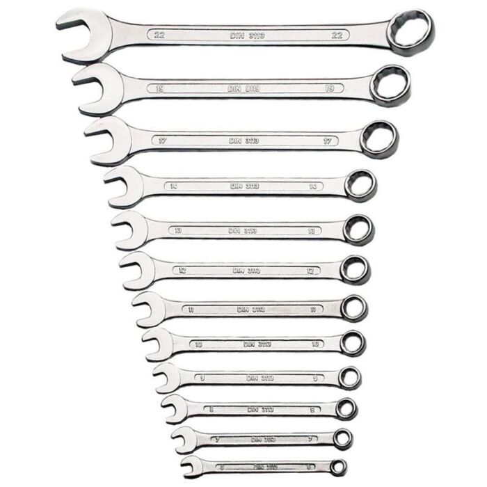 Deze steek-ringsleutelset bestaat uit 12 sleutels in maten variërend van 6mm tot 22mm. Het gebruikte materiaal is chroom vanadium staal, dat geliefd is om zijn sterkte en bestendigheid tegen slijtage. De gepolijste bek zorgt voor een betere grip en bescherming tegen corrosie.