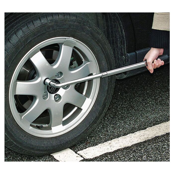 De wielmoersleutel heeft een uitschuifbare lengtemaat van 35 tot 55 cm, wat zorgt voor een bereik dat aanpasbaar is aan verschillende situaties. De sleutel is vervaardigd uit hoogwaardig staal, waardoor deze niet alleen duurzaam is, maar ook bestand tegen slijtage en intensief gebruik.