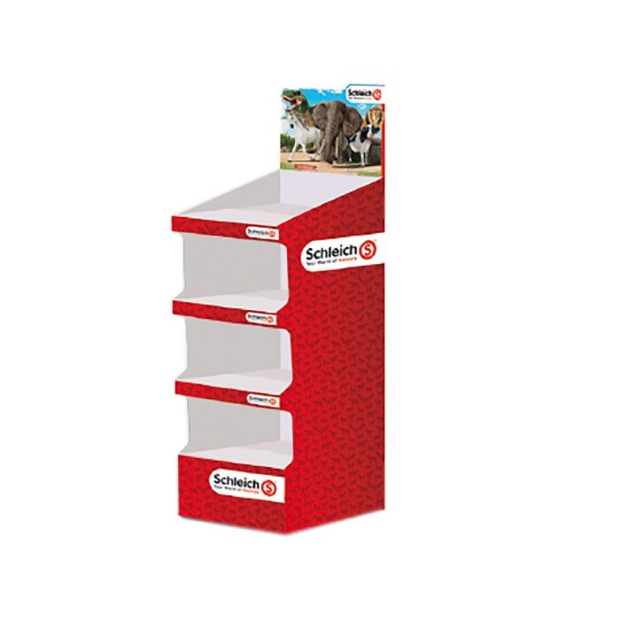 Het ontwerp van de display is eenvoudig maar effectief, met voldoende ruimte voor het presenteren van Schleich-producten op een aantrekkelijke manier.