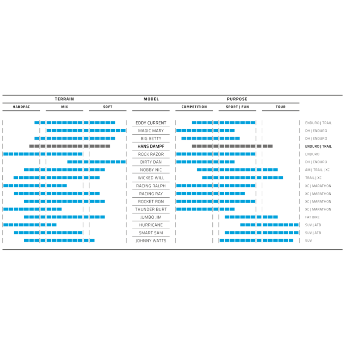 Deze band is ideaal voor all-mountain- en enduro-rijders die regelmatig uitdagende paden willen verkennen. De Hans Dampf Super Trail is geschikt voor zowel e-bikes (E-25) als reguliere mountainbikes, waardoor hij veelzijdig inzetbaar is, van off-road avonturen tot recreatieve ritten over heuvelachtig terrein.
