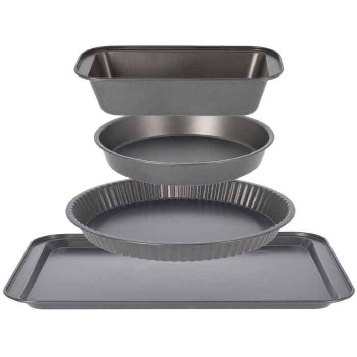 De bakset is gemaakt van metaal, wat zorgt voor een uitstekende warmtegeleiding. De set bestaat uit een metalen bakplaat van 41 x 28 x 2 cm, een rechthoekige bakvorm van 25 x 13 x 6 cm, en twee ronde bakvormen met diameters van 29 x 3 cm en 26 x 3 cm. Deze stevige constructie maakt de bakvormen betrouwbaar en duurzaam, perfect voor dagelijks gebruik.
