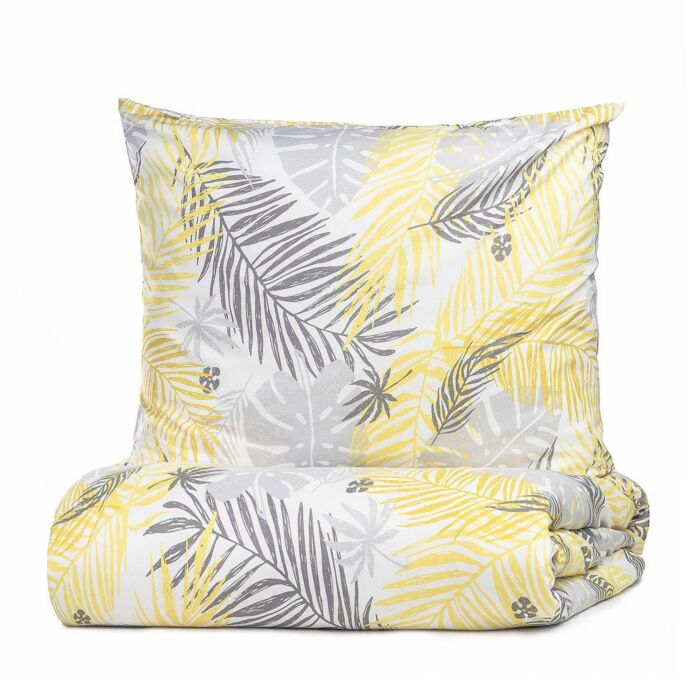 Saai wit beddengoed is verleden tijd - de fabrikant heeft gekozen voor een sneeuwwitte achtergrond met grijze, grafiet en gele monstera. Zo'n kleur brengt ongetwijfeld contrast in onze kamer, maar verlevendigt ook de hele ruimte rondom.