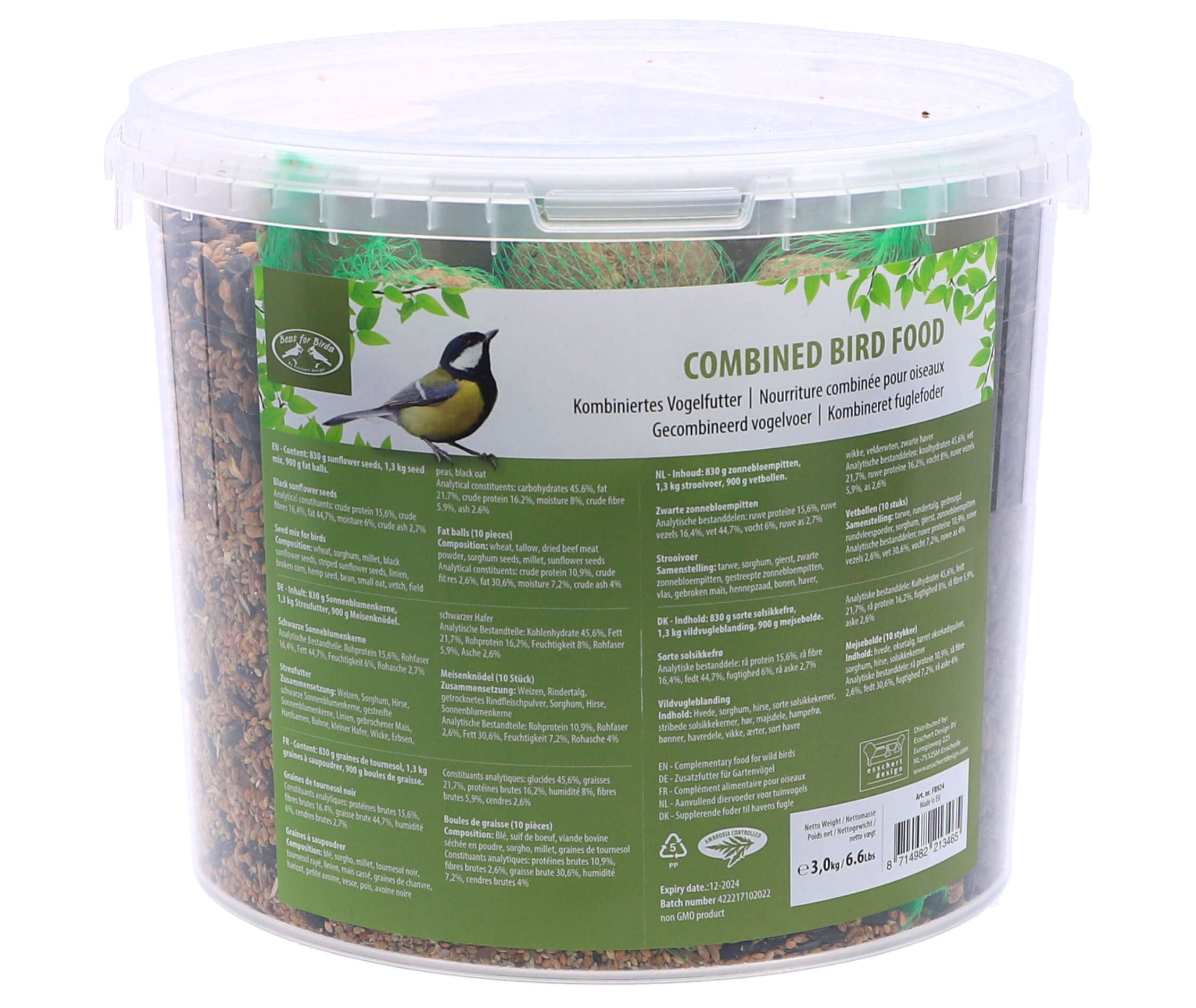 De vogelvoermix kan het hele jaar door worden gebruikt om vogels in de tuin te voeden. Plaats de emmer op een geschikte voederplaats en geniet van het uitzicht op de vogels die van dit heerlijke voer smullen.
