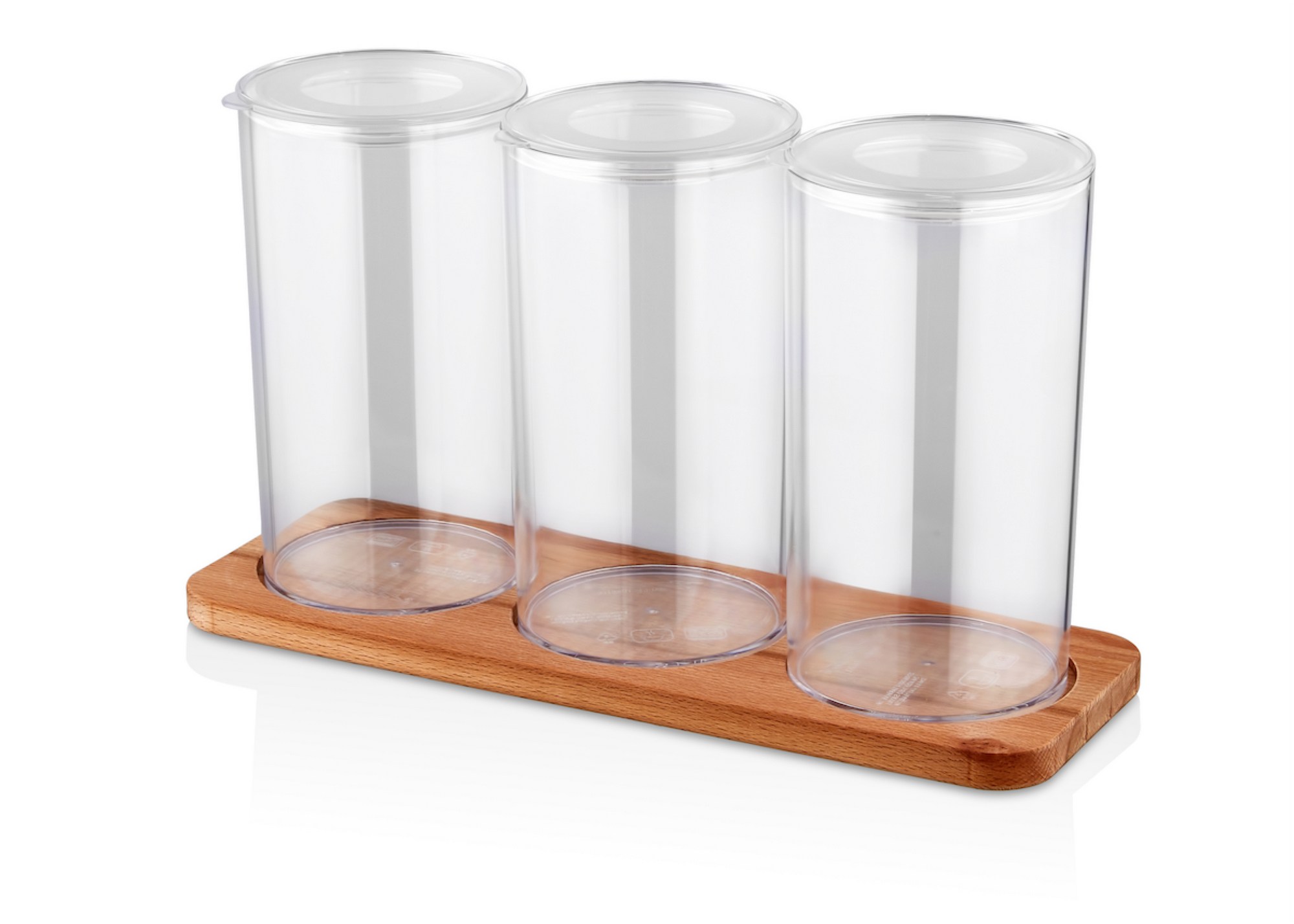 Met drie potten van 10 x 10 x 19 cm en een inhoud van 1000 cc biedt deze set voldoende opbergruimte voor je ingrediënten, kruiden of zelfs klein keukengerei. De standaard van 33 x 11. 5 x 19 cm, houdt je potten netjes georganiseerd en voegt een vleugje verfijning toe aan je aanrecht.