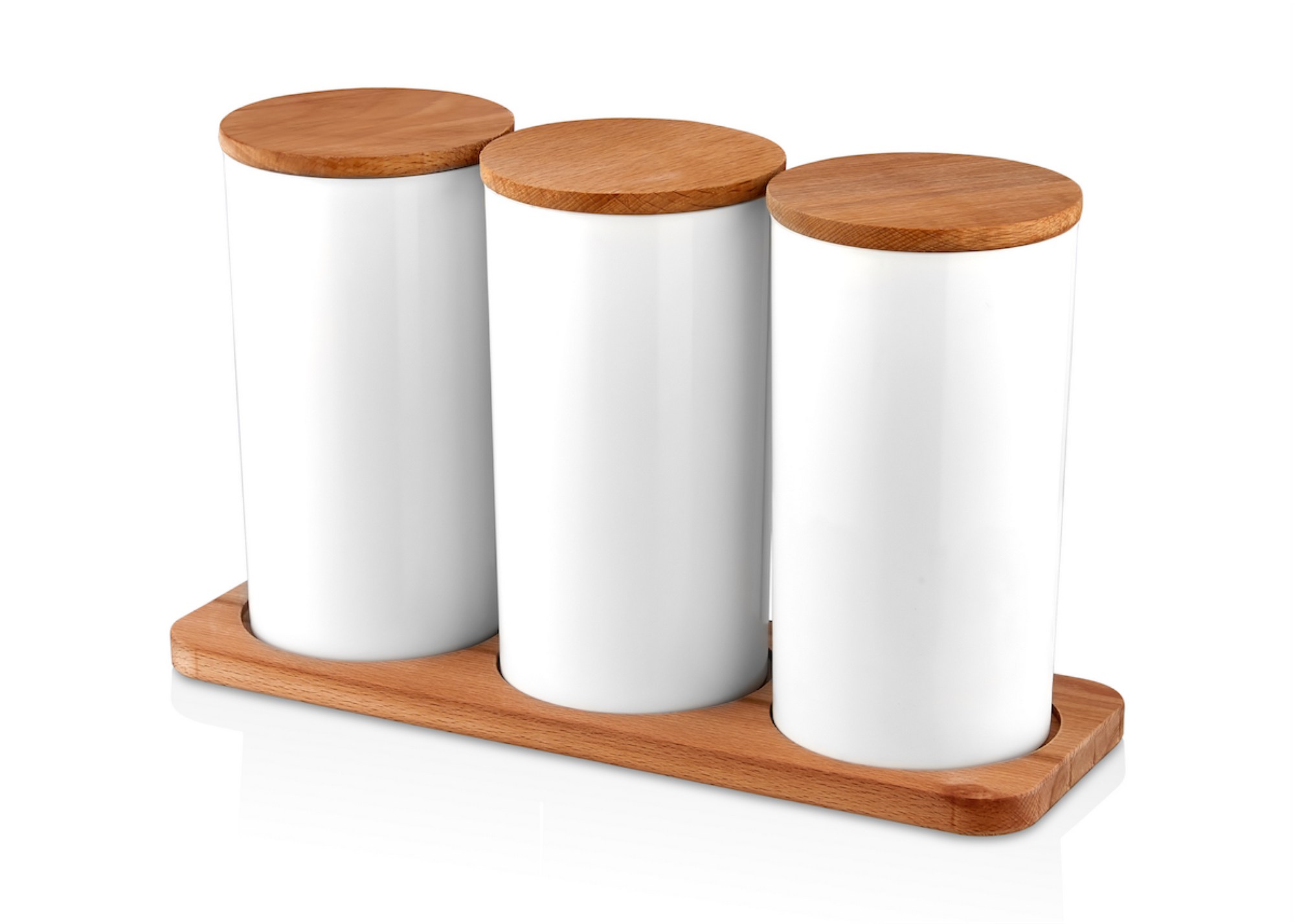 De set bevat drie potten (10 x 10 x 14 cm) met een inhoud van 800 ml, ideaal voor het bewaren van kruiden, specerijen en snacks. Dankzij de houten standaard (33 x 11,5 x 15 cm) staan de potten overzichtelijk en binnen handbereik.