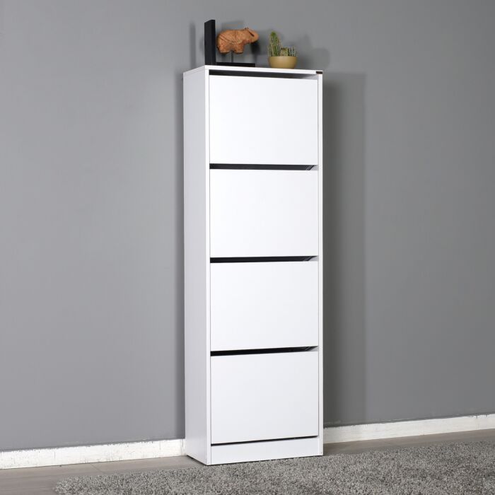 Met vier royale lades en meerdere plankniveaus biedt deze schoenenkast een efficiënte en overzichtelijke opbergoplossing voor je gehele schoenencollectie. Het strakke, minimalistische design past moeiteloos in elk interieur en zorgt voor een opgeruimde, moderne uitstraling.