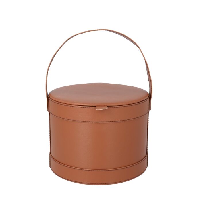 De RINGA kast heeft de vorm van een cilinder van 19,5 x 19,5 centimeter. Het product is gemaakt van kunststof en polyurethaan, materialen die bekend staan om hun duurzaamheid en sterkte. De buitenkant is bruin, terwijl de binnenkant een zwarte voering heeft. Het handvat zorgt voor gemakkelijk transport.