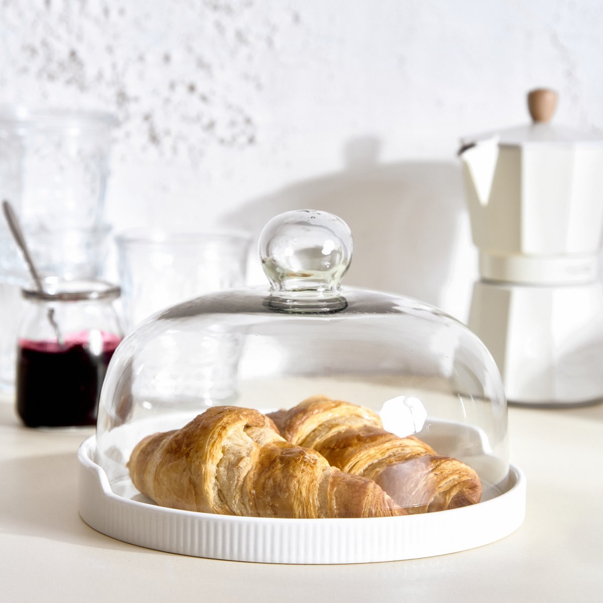 De FINCAN-serie bestaat uit twee onderdelen: een glazen deksel in halve cirkelvorm en een lichtgrijze porseleinen schaal met een diameter van 22 cm. De glasplaat sluit nauw, zodat uw gebak langer vers blijft.