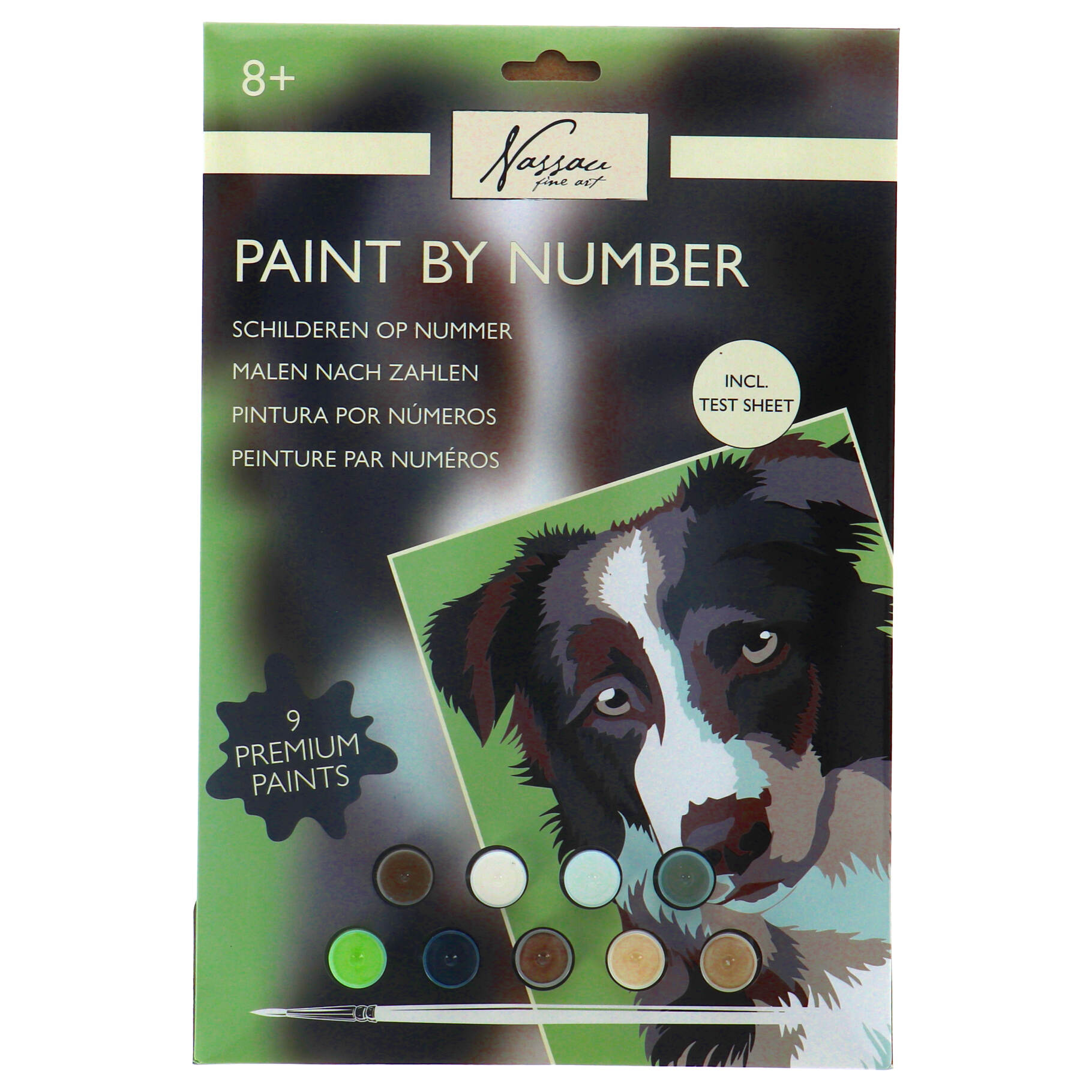 Dit schilderen op nummer set bevat een canvas met de afmetingen X bij Y cm en hoogwaardige verf in diverse kleuren om uw hondenafbeelding tot leven te brengen.