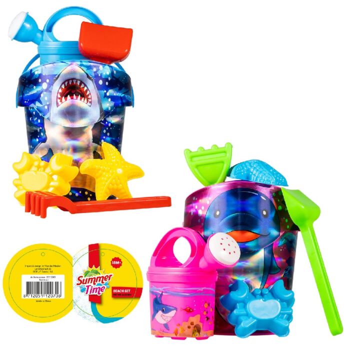 De Summertime Strandset is een superleuke 7-delige set voor op het strand, allemaal voorzien van een coole laserprint. Deze set bevat een emmer, gieter, harkje, schepje, 2 zandvormen en een zeef, waarmee kinderen eindeloos plezier zullen beleven op het strand of in de zandbak. De set is verkrijgbaar in twee verschillende designs, zodat er voor elk kind een passende variant is. Bovendien is elk onderdeel voorzien van een Summertime hangtag, waardoor de authenticiteit gegarandeerd is. Geschikt voor kinderen vanaf 18 maanden.