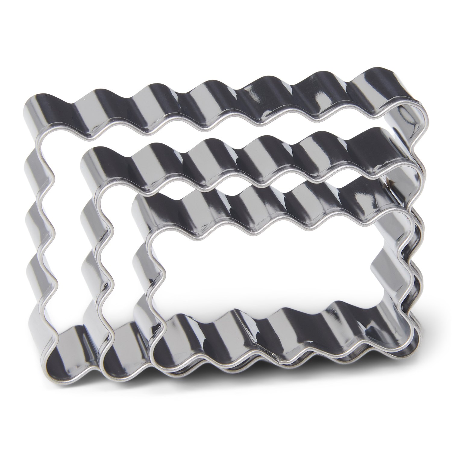 De set bevat drie rechthoekige uitsteekvormen in verschillende afmetingen, vervaardigd uit roestvrij staal voor optimale duurzaamheid en gladde randen.