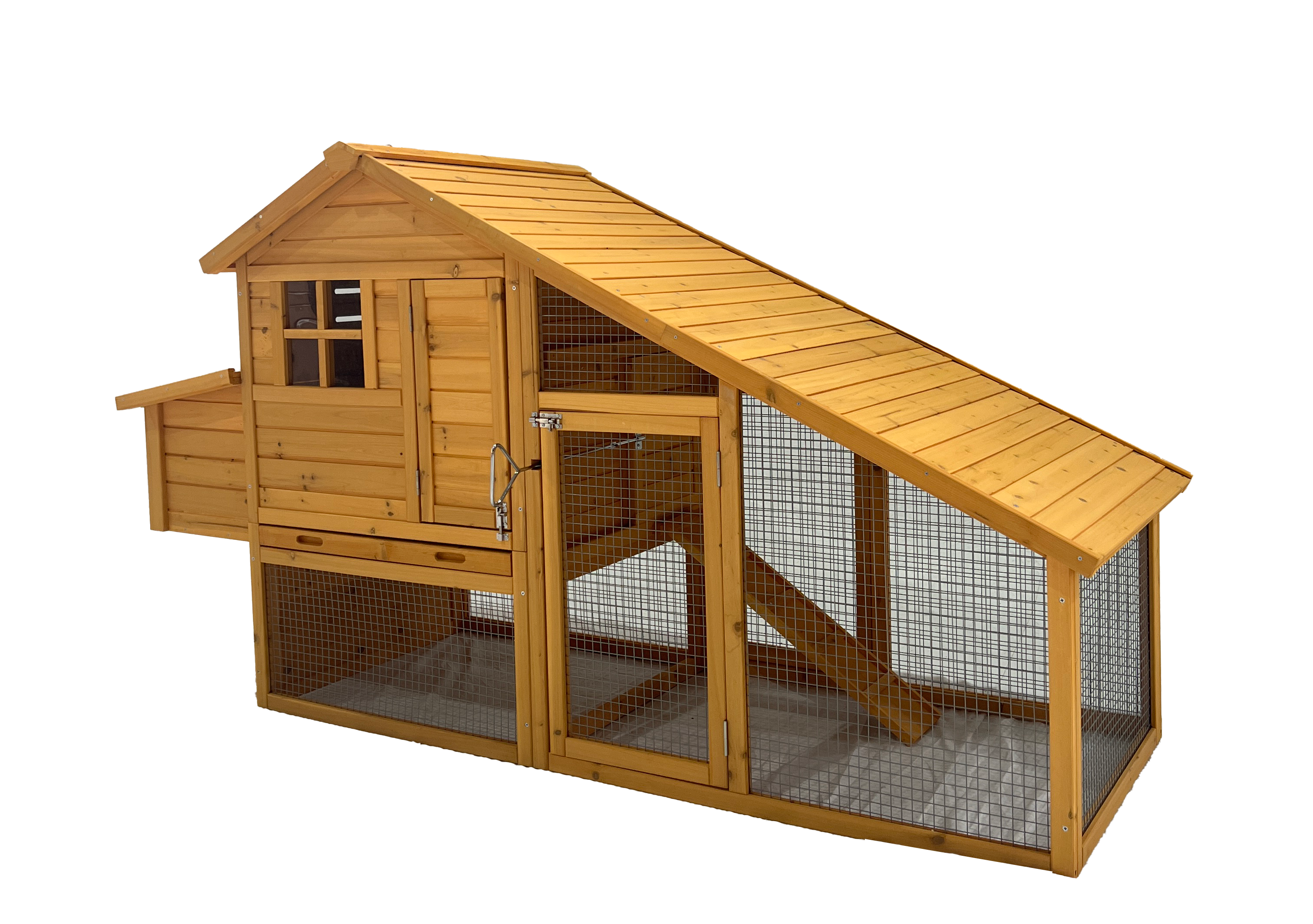 Het lange schuine dak biedt de perfecte dekking, zelfs in de stromende regen houdt het je kippen en voedsel droog.