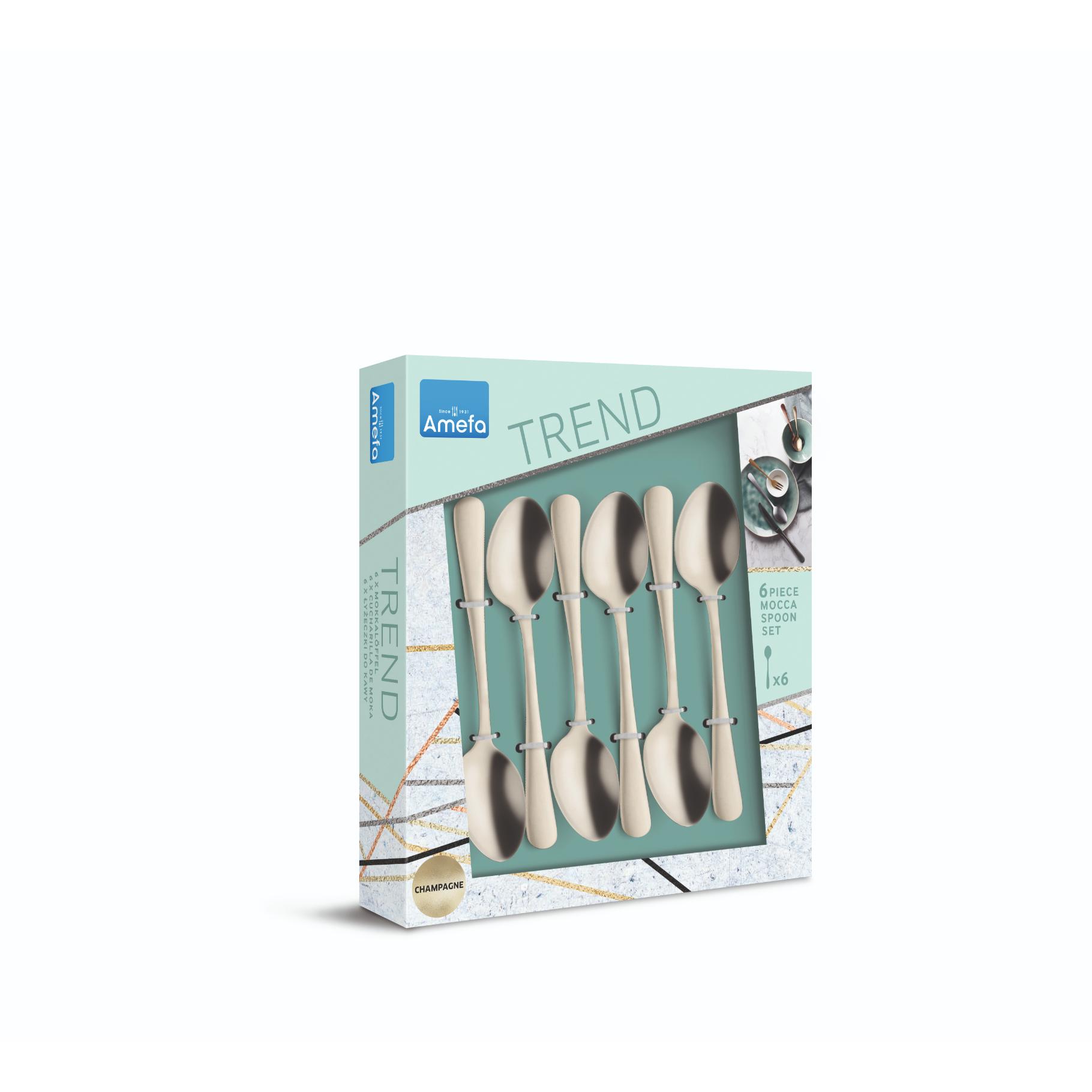 De Amefa theelepels in champagnekleur zijn een set van 6 elegante theelepels. Deze stijlvolle set voegt een vleugje klasse toe aan uw servies en is perfect voor dagelijks gebruik of bij speciale gelegenheden.