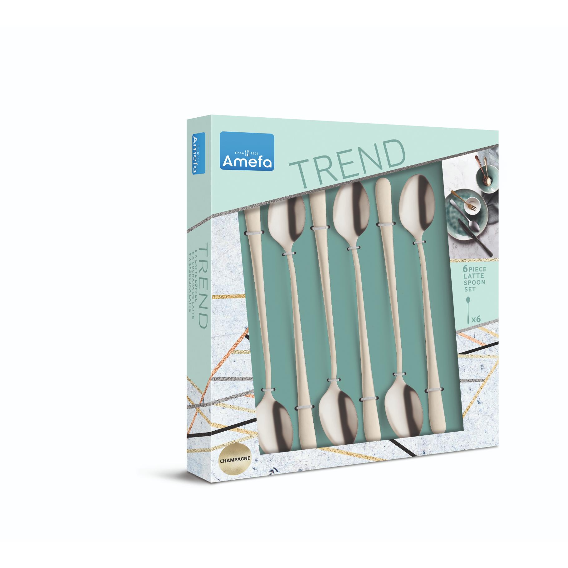 De Amefa latte lepels zijn een set van 6 stuks in een elegante champagnekleur. Geschikt voor het serveren van latte macchiato's en andere koffiespecialiteiten met stijl en klasse.