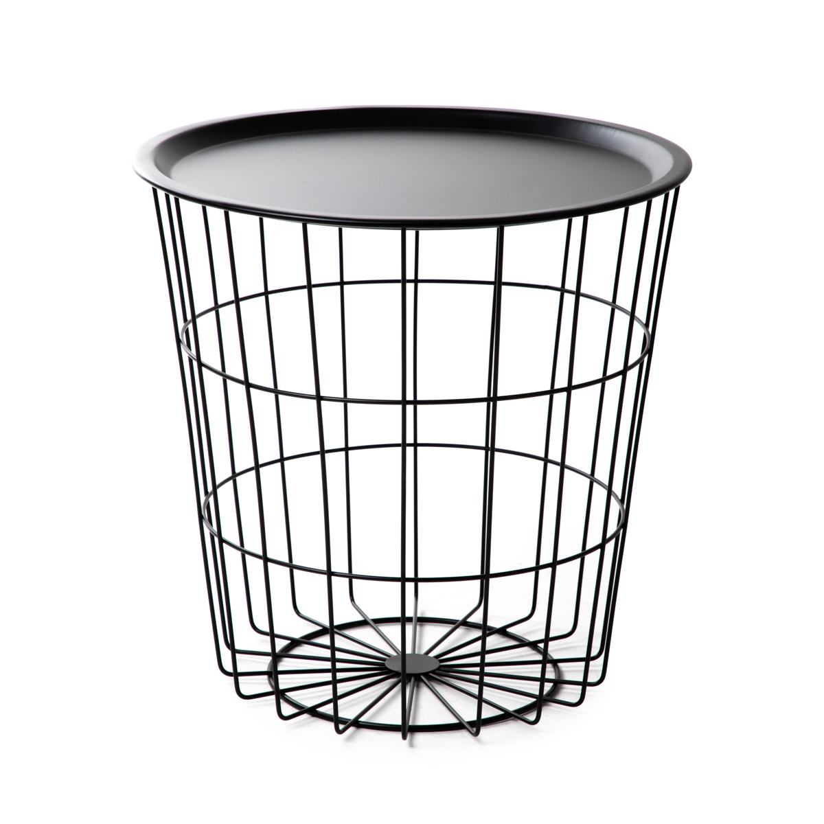 Moderne HOMLA SCANDI tafel met opbergruimte. De tafel heeft de vorm van een metalen mand met een rond blad. Dankzij de lichtgewicht constructie verplaats je hem gemakkelijk naar elke plek om er een beker drinken en een bordje snacks op te zetten. Door de zwarte kleur en de eenvoudige vorm past hij gemakkelijk in de meeste moderne arrangementen.
