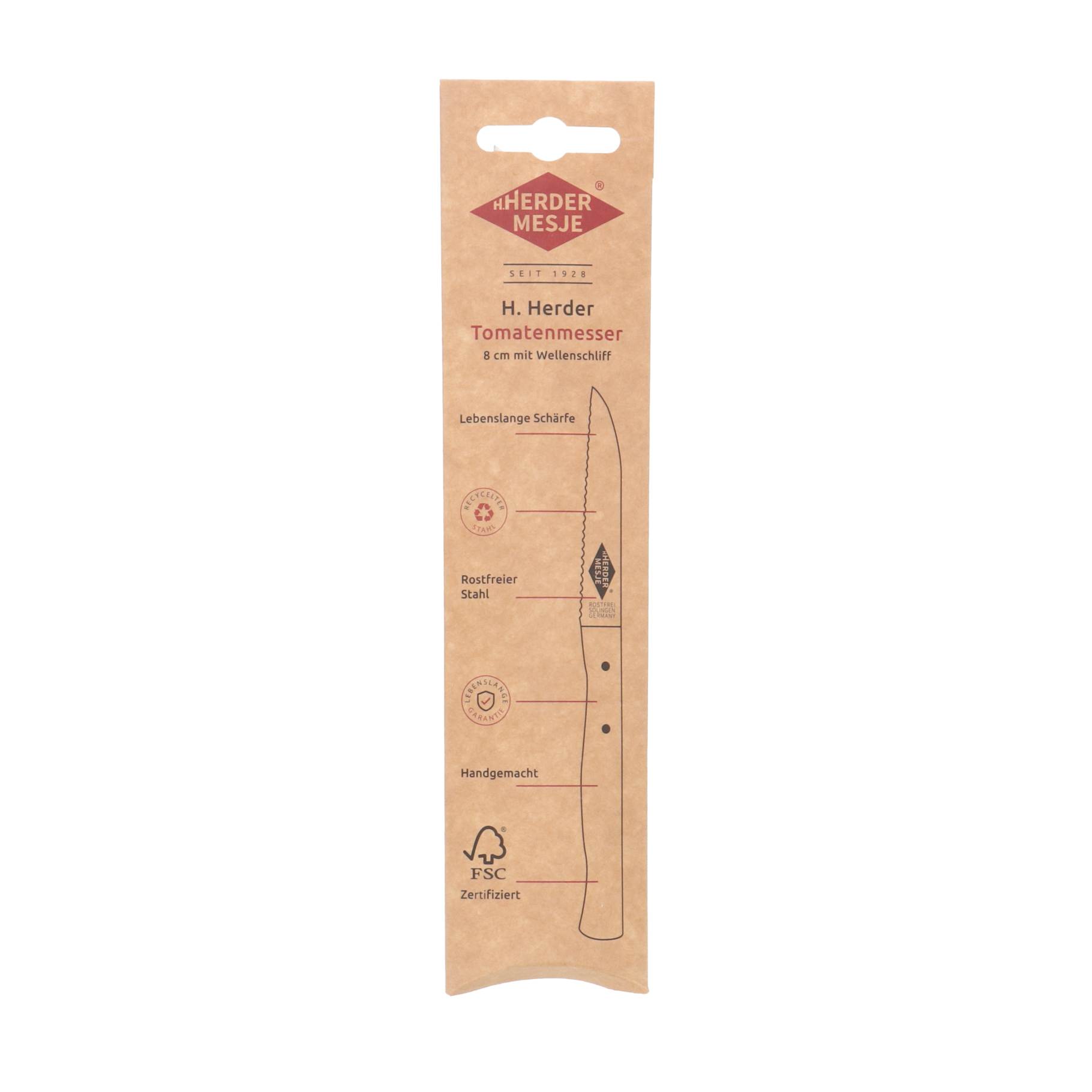 Het Herder tomatenmes met kartel en FSC-beukenheft is een uitstekende toevoeging aan uw keuken. Dit mes is speciaal ontworpen voor het moeiteloos snijden van tomaten, dankzij de scherpe kartelrand en het ergonomische beukenhouten handvat. Gemaakt van hoogwaardig roestvrij staal, is dit mes duurzaam, corrosiebestendig en gemakkelijk schoon te maken.