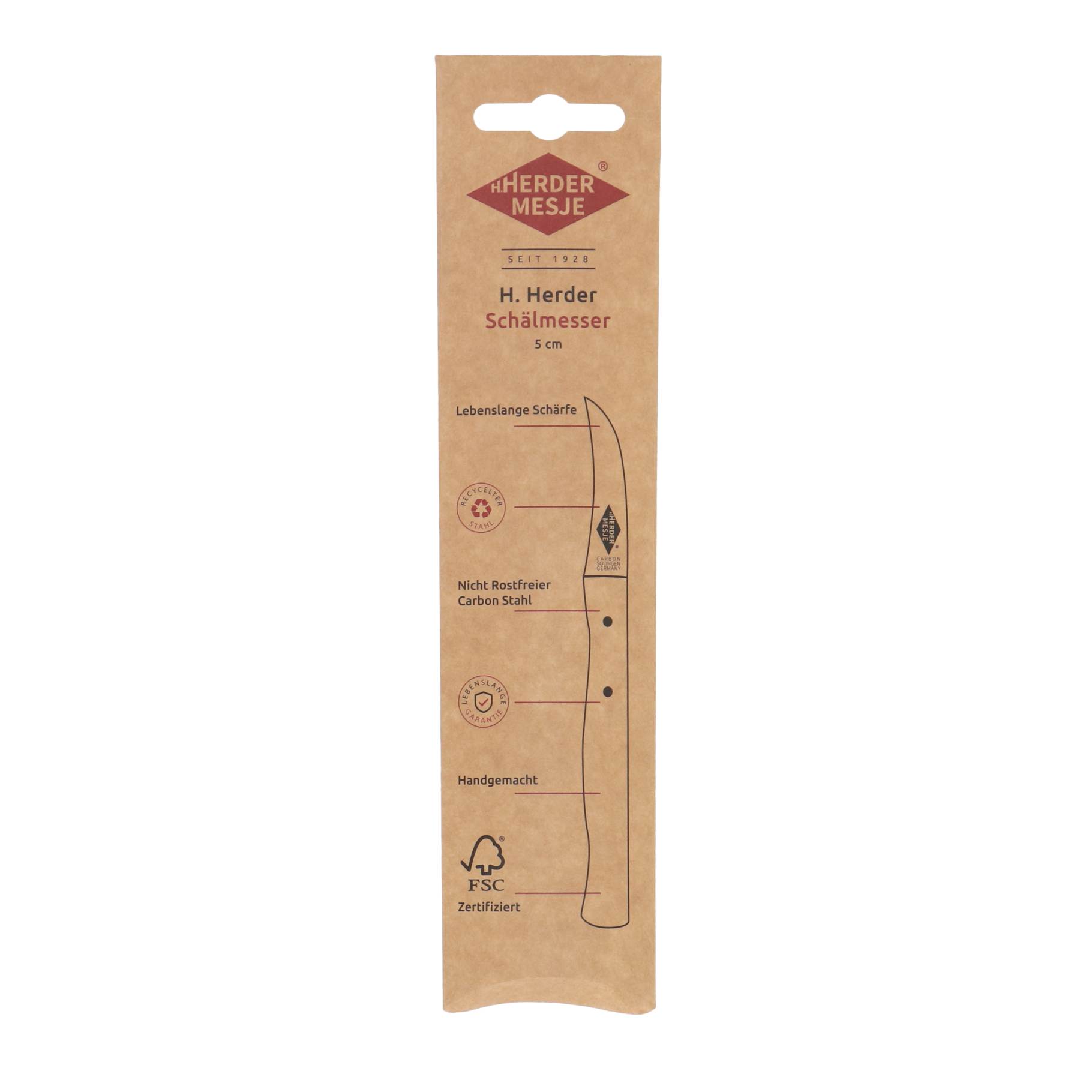 Dit Herder-schilmes is uitgerust met een gebogen lemmet, ideaal voor het moeiteloos schillen van groenten en fruit. Het heft van FSC-gecertificeerd beukenhout biedt een comfortabele, stevige grip, terwijl het carbon lemmet zorgt voor duurzaamheid en blijvende scherpte.