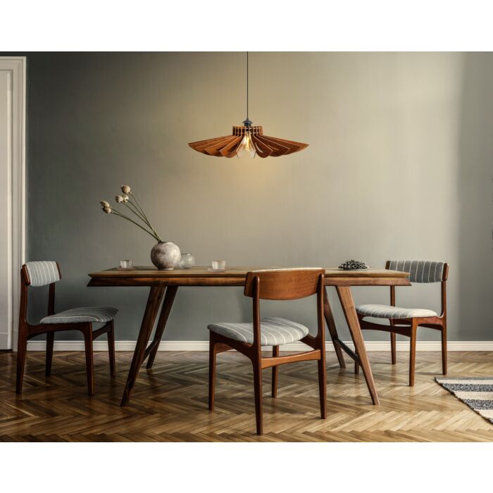 Deze kroonluchter heeft een totale hoogte van 45 cm met een ronde kap van 11 cm hoog en een diameter van 52 cm. Gemaakt van 3 mm MDF, biedt het een uitstekende duurzaamheid en een lange levensduur. De okkernootkleur voegt een elegante uitstraling toe die zich makkelijk in verschillende interieurstijlen laat integreren.