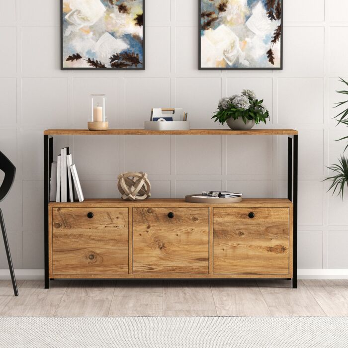 Onze console ziet er niet alleen geweldig uit, maar biedt ook extra opbergmogelijkheden. Het industriële en landelijke ontwerp voegt een vleugje verfijning en elegantie toe aan elke ruimte. Of je nu een modern of traditioneel interieur hebt, deze console past er naadloos in en creëert een harmonieuze en stijlvolle sfeer.