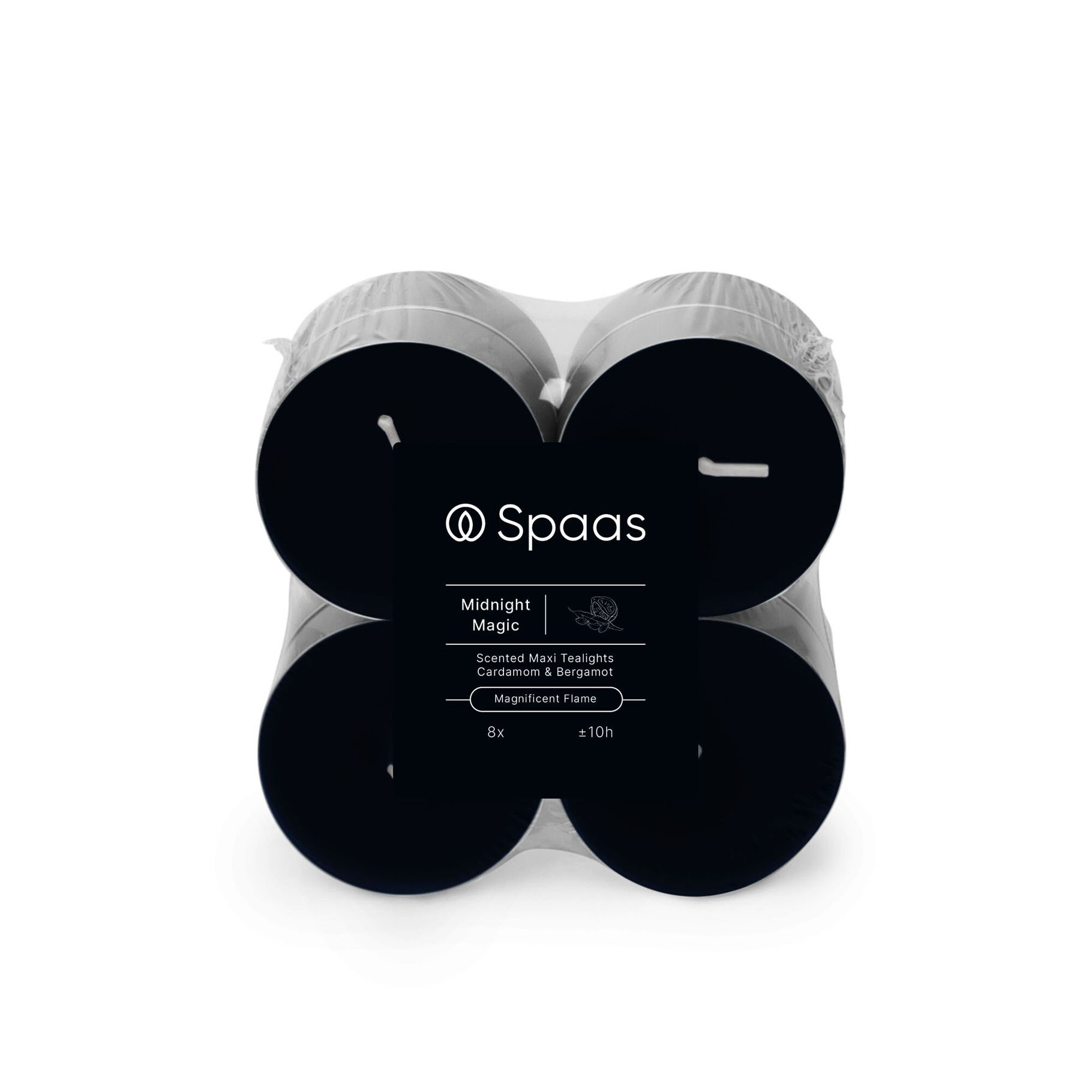 Het ontwerp van de Spaas Maxi geurtheelichten is optimaal voor gebruik in verschillende soorten houders, van glazen tot metalen. Ze kunnen ook afzonderlijk worden gebrand in een theelichthouder. De geur Midnight Magic is een mix van rijke en mysterieuze aroma's die zorgen voor een luxe en uitnodigende sfeer.