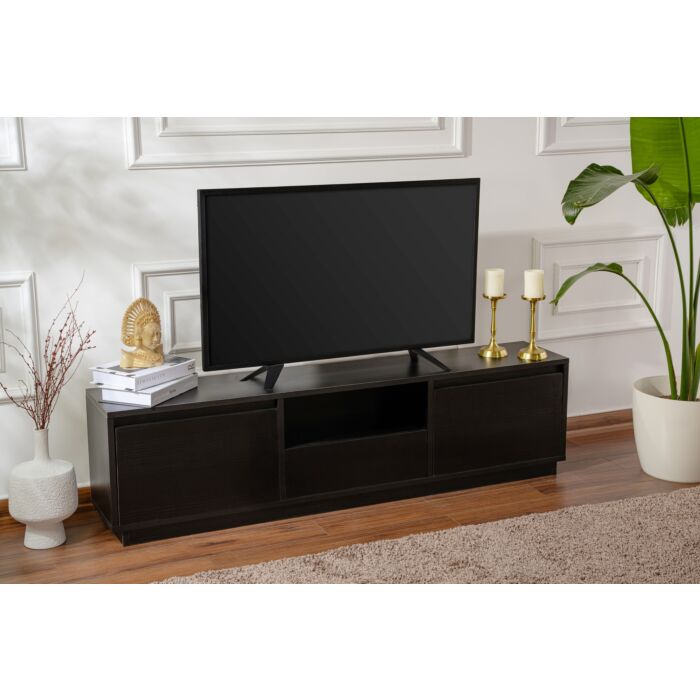 Met een breedte van 160 cm, een hoogte van 42 cm en een diepte van 29,5 cm is dit tv-meubel de perfecte maat voor de meeste woonkamers. Het biedt voldoende ruimte voor je tv, mediaspelers en andere entertainmentbenodigdheden en houdt alles georganiseerd en binnen handbereik. Deze tv-standaard is gemaakt van 100% gemelamineerd spaanplaat en is niet alleen stijlvol, maar ook duurzaam en gaat lang mee. De dikte van 18 mm zorgt voor stabiliteit en stevigheid, terwijl de houtzwarte kleur een vleugje verfijning toevoegt aan elke kamer.