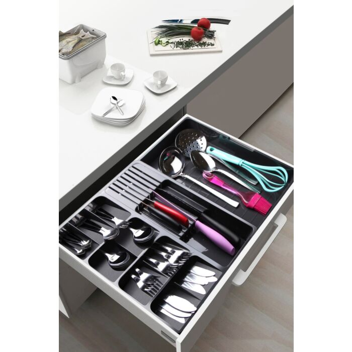 Met afmetingen van 50 x 40 x 6,5 cm biedt onze bestekhouder voldoende ruimte voor al je bestekbenodigdheden. Hij is zo ontworpen dat hij perfect op je aanrecht past, waardoor je kostbare ruimte bespaart en je bestek toch makkelijk bij de hand hebt.