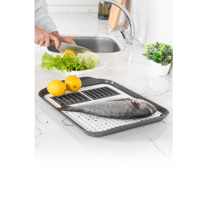 Dit afdruiprek is vervaardigd uit 100% kunststof en weegt licht genoeg voor dagelijks gebruik. De materialen zijn BPA-vrij, wat bijdraagt aan een veilige gebruikservaring. Met de afmeting van 41,5 x 30 cm is het design perfect voor zowel kleine als grotere keukens.